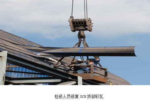 在高温环境下作业,困难重重。检修人员头顶烈日,在毫无遮蔽的脱硝设备顶部,直面酷热的考验。检修人员面对50度的高温毫不退缩,严格按照操作流程,有条不紊地进行拆除破损彩瓦、安装新彩瓦等工作。