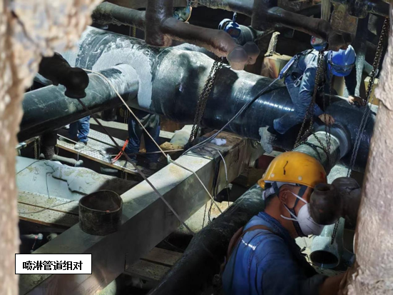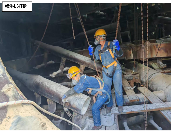 维修方案确定后,攀蓝鼎立即开始着手喷淋管道采购预制工作,考虑到目前烧结产能不饱和,系统多处停机的因素,决定预制管道到厂后由检修进行拆除及更换,只保留技术性要求较高的玻钢粘接由专业施工人员来完成。7月24日,在材料到厂后,检修立即开始在塔内布置安全措施,并进行喷淋层打拆工作,打拆过程中检修对切下的三通支管进行仔细甄别,磨损严重的进行报废处理,还具备使用价值的作为备件归置,以确保物尽其用。打拆完毕后,检修随即进行管道吊装及内部组装配管工作,配管完成后防腐单位开始进场作业,在此过程中检修全程安排人员进行组对及工程质量监督工作,并及时撤场收尾。